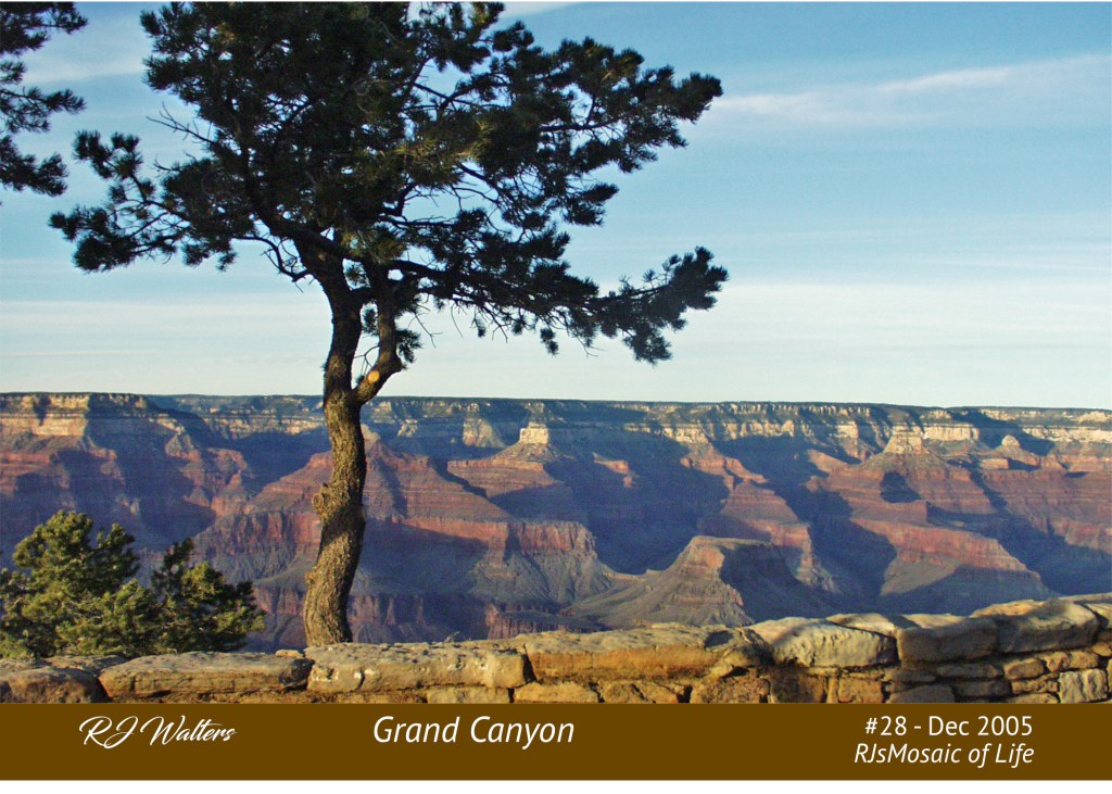 The last time I was at the Grand Canyon was when this picture was taken in 2005. I have been there on two other occasions. What was special this time was that we stayed in the lodge on the south end of the canyon. We could lie in our bed at the national park lodge as see the canyon about 50 feet away. It was like the other two times I had visited there in that it just didn’t seem real. The grandeur of it was just beyond imagination. One of the “woulda, coulda, shoulda” things I regret not doing was to take a trip to the bottom of the canyon and look up, instead of down. If you ever get a chance to do that, you absolutely should, or you, like me, will regret it.