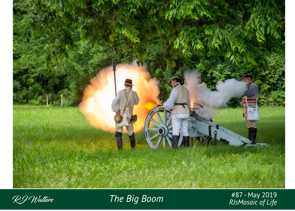 Sometimes you get lucky and click the shutter button at just the right instance. That pretty much describes today’s mosaic. Several of the reenactments I have visited have booming cannons, but I never realized how dramatic they were. Yes, when these types of pictures were taken, I could hear the cannon, but my mind never saw the flash as dramatic as it was. But, then again, I really could not “hear” them, but instead felt them across my chest. But to me, that qualifies as hearing.