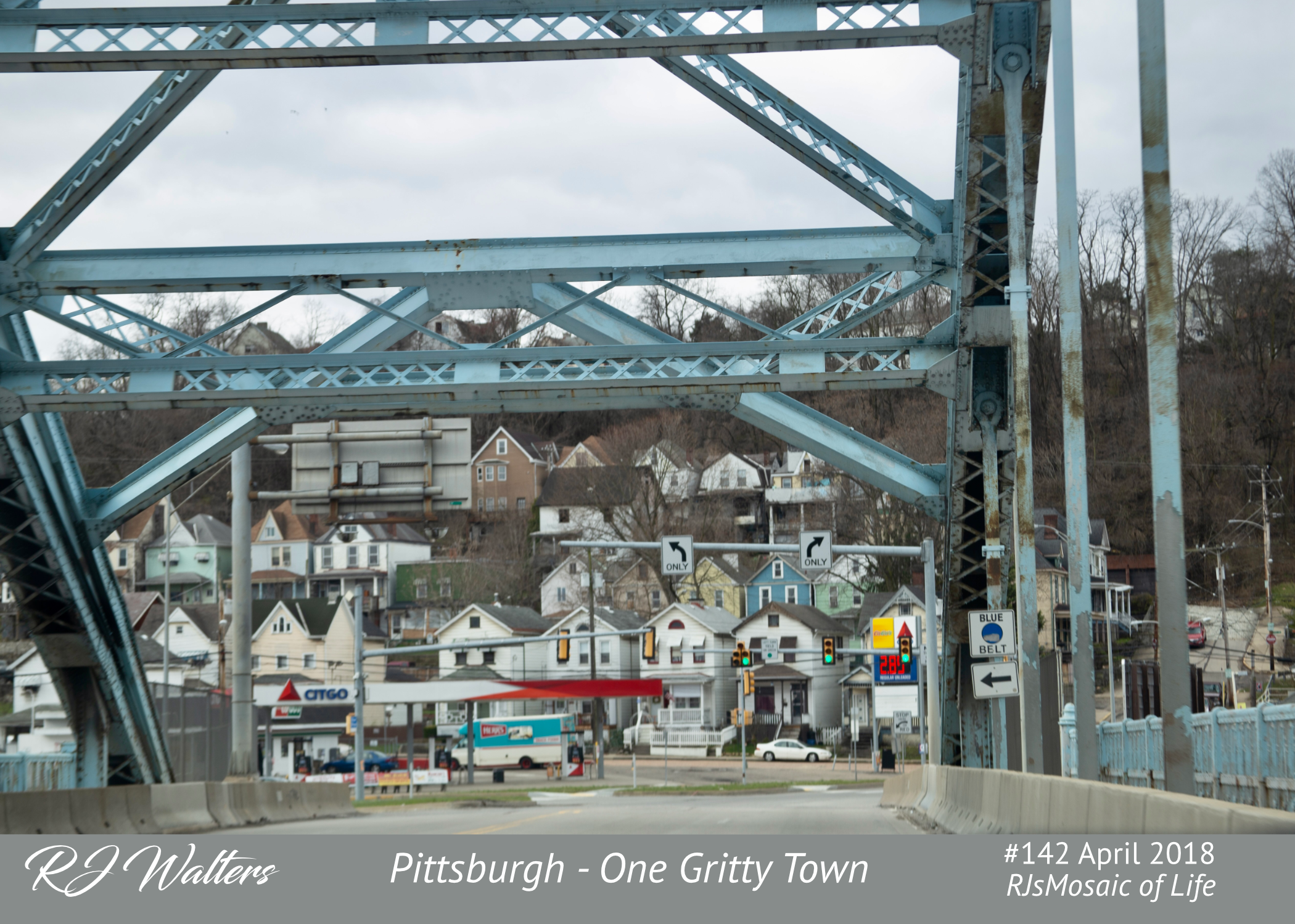 The picture here is what my mind’s eye sees when I think of Pittsburgh. A crude steel bridge in need of paint, and the houses 3 feet apart with the almost obligatory front porch.
