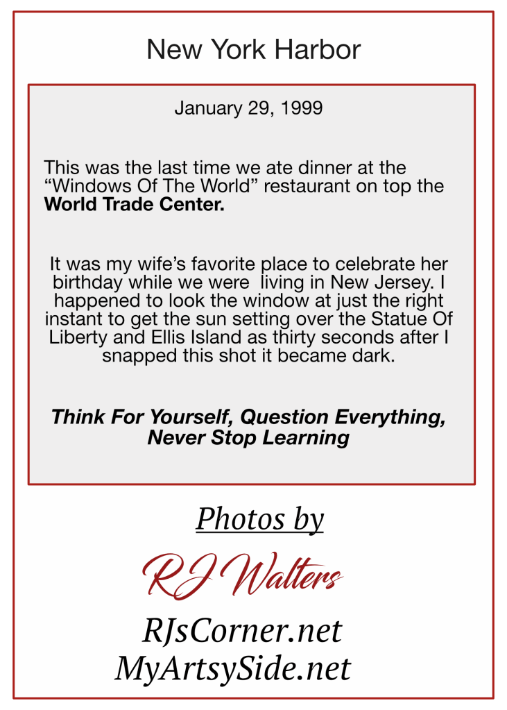 This is perhaps the best serendipity picture I have taken in my 55 years as a photographer. The story is to the right. Our last visit to NYC was in 2017. The World Trade Center was gone, but its replacement also has a restaurant on its top floors.